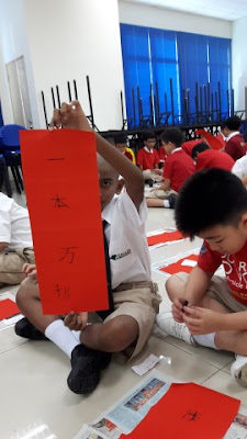 So, it's the Lunar New Year mood and enthusiastic teacher Lily insists that the students too must have a try at the brush. I must confess that I have never held that brush before in my full age.